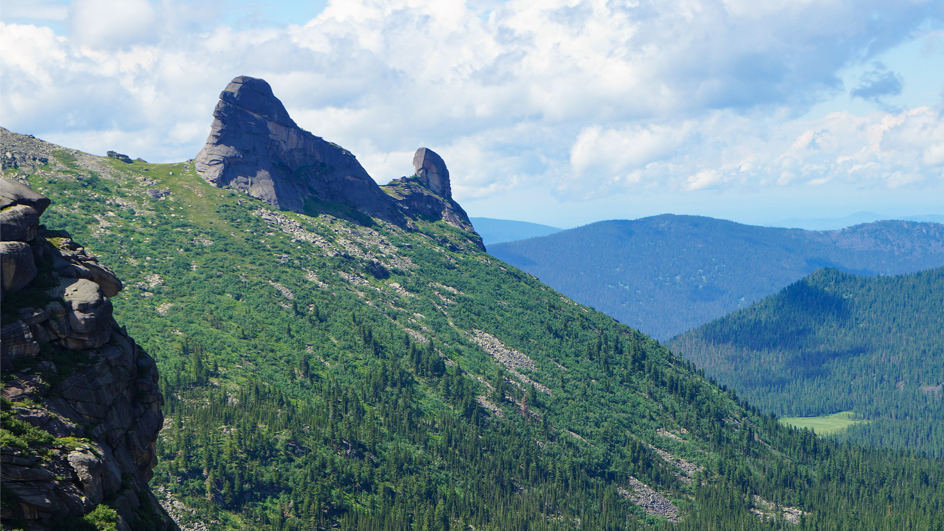 Далее подъём по курумнику (каменные россыпи) к «голове» Спящего Саяна - тропа идёт по чередованию альпийских лугов и небольших каменных площадок. Здесь можно увидеть массив Спящего Саяна максимально близко и «дойти до волос» образной вершины.Финальная точка маршрута - скала Кит, геологическая форма с контуром морского гиганта. Со смотровой площадки открывается панорама долины реки Кебеж, Каменного замка, скалы Черепаха и массивов Спящего Саяна.