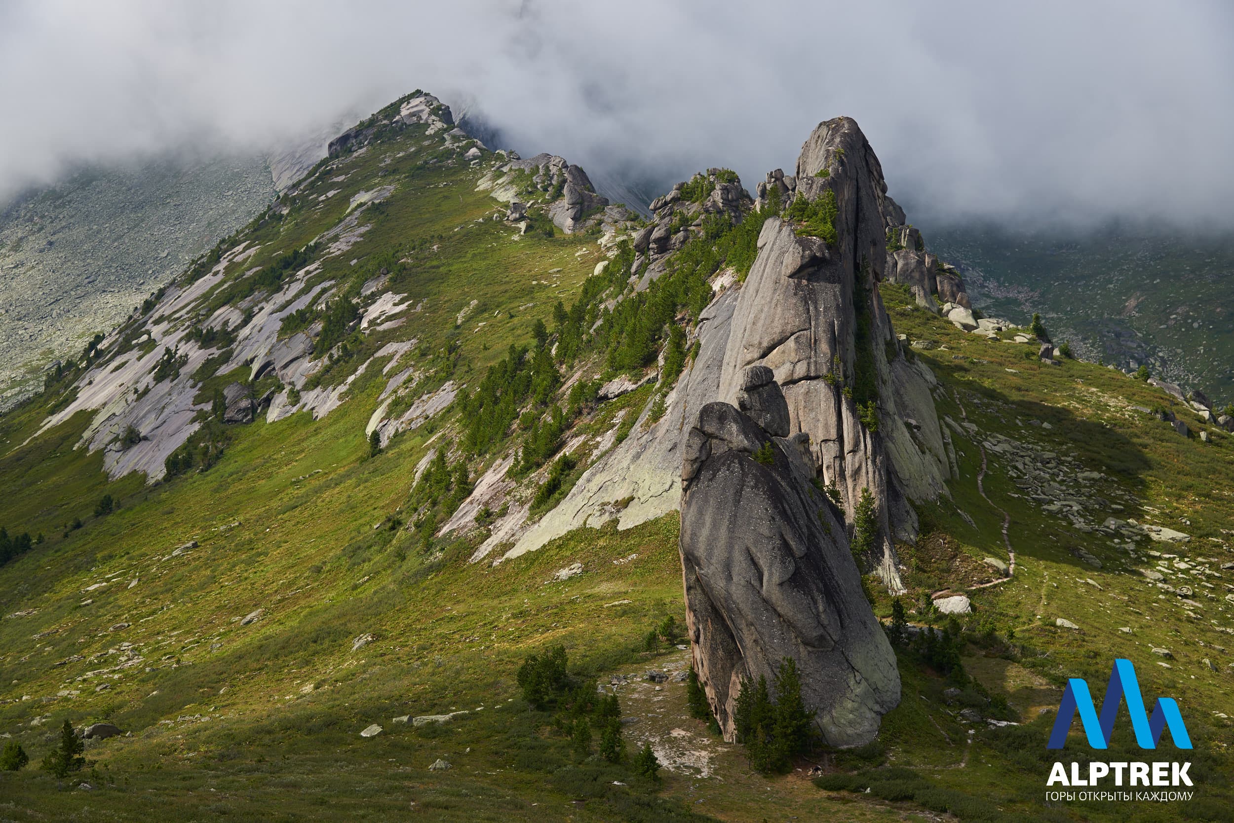 •скалу Спящий Саян - один из символов Ергаков.Для желающих и готовых к дополнительной нагрузке будет возможность подняться выше - на перевал Художников, откуда открывается вид на долину скалы Параболы. Пока часть группы поднимается на перевал, остальные могут отдохнуть у горного озера и искупаться при желании.